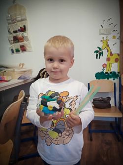 Kiedy mamy uczą się angielskiego my odbywamy zajęcia w ruchu. Sprawdzamy siły w zabawie w zapasy i rozwijamy wrażliwość plastyczną.