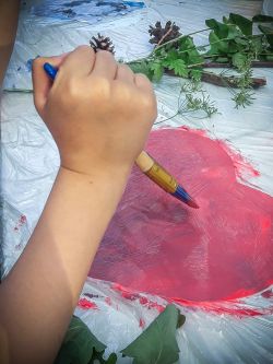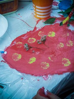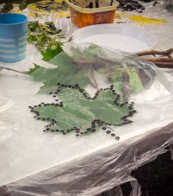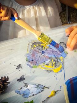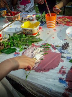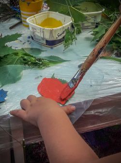 Z ogrodu i okolicznego lasu zbieramy skarby natury; np. opadłe liście, patyczki, korę, nasionka, zasuszone kwiaty, następnie układamy kompozycję, przykrywamy projekt folią basenową i malujemy witraż. Po malowaniu dzieci wycinają odpowiedni kształt witraża. Prace są zabierane przez dzieci do domu. 🔸 nauka myślenia w sposób wielopłaszczyznowy, tworzenie z wykorzystaniem elementów natury