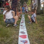 Malujemy fotografię matki natury. W ogrodzie rozwieszamy pomiędzy konarami drzew strecz w taki sposób, że tworzy on półprzeźroczystą, wysoką ścianę – nazywaną przez nas kliszą. Pierwsza grupa dzieci przechodzi na jedną stronę kliszy i staje nieruchomo tak, by reszta dzieci mogła wymalować kontury ich sylwetki. Po wymalowaniu postaci dzieci w parach lub grupach ubogacają postacie o leśny strój, kwiaty, ptaki, wytworne czapy, łuki, zwierzęta itp. Na samym końcu z odpowiednio zaprojektowanymi kliszami w tle, dzieci opowiadają baśń o namalowanych bohaterach. 🔸 nauka przestrzennego myślenia, praca w grupach, kreatywne działania abstrakcyjne